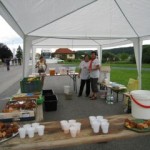 Dann gingen wir wieder zu unserem Stützpunkt zurück. Wobei die Distanzen von: Startnummernausgabe, Start/Ziel, Labestation 1 alles nur ein paar Meter nebeneinander liegt. Es ist 14.00 Uhr und der Start erfolgt. Michael beginnt bei unserer und Franzi bei der anderen Staffel als 1. Läufer. Wir wechseln nach 5 Runden (10,550 Kilometer). Dann müssen Reinhard und ich raus auf die Strecke. Christine fotografierte wie wild. Wir hatten ein super Laufwetter, nicht so wie im Vorjahr, da hatte es beim Start 30 Grad mit Sonnenschein pur und 3 Stunden später regnete es in strömen.