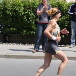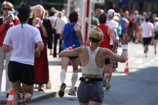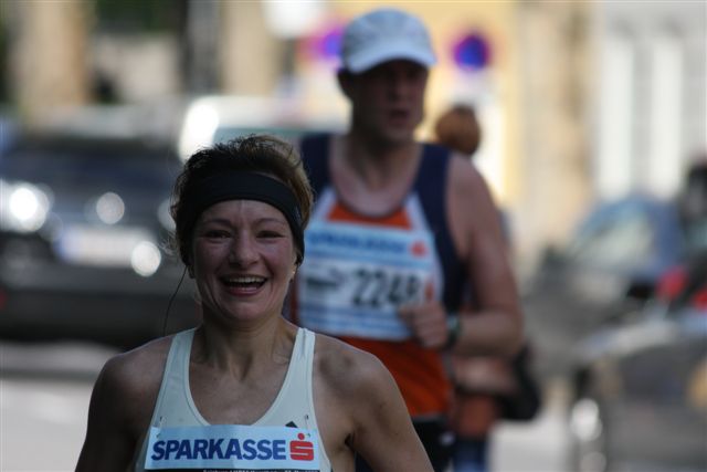 und 1 Minute früher starten. Plötzlich ging es auch schon los. Neben mir liefen aufeinmal so viele Läufer vorbei. Ich dachte, Conny, Michi und Daniel sind auch vorne, ich habe Sie aus den Augen verloren. Ich lief einfach der Masse nach. Nach ca. 500 Meter sah ich Michi mit seinem Fotoapparat stehen und fleißig Fotos machen. Der erste Kilometer war schnell da. Ich drückte den Kilometer auf meiner Uhr ab und bekam einen Schock. Bin den Kilometer in 4:02 gelaufen. Es kam mir viel langsamer vor, das kann nicht sein. Die Worte von Martin (Coach) im Ohr – laufe die Kilometer in 4:25 – 4:30 und versuche immer einen 2er (4:2.) auf der Uhr zu sehen. Jedoch hat er nicht gemeint, das der zweier so (4:02) steht. Ich nahm das Tempo zurück und beobachtete den Puls, der gleichmäßig auf 178 war. Auch der zweite Kilometer war rasch da und diesmal war auf meiner Uhr eine 4:09 zu sehen. Ich versuchte nocheinmal das Tempo zu zügeln und bei Kilometer 3 war endlich die gewünschte Zeit 4:23 oben. Ich bekam von der Strecke sehr wenig mit. Meine Augen waren am Boden, die Kilometertafeln und auf die Uhr gerichtet. Ich weis noch, das es durch eine Allee zum Schloß ging, wo dort ein roter Teppich ausgerollt lag. Fand ich sehr nett. Ich war leider wieder etwas zu schnell von 3 auf 4 unterwegs (4:19). Jetzt beschloß ich auf die Zeit weniger Rücksicht zu nehmen und nur meinen Puls unter 180 zu halten. Es wurde mir ein bischen