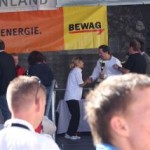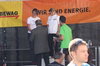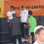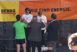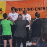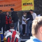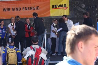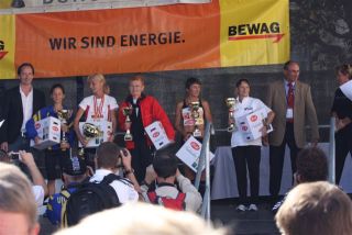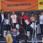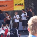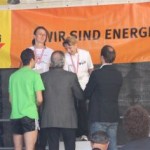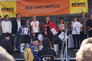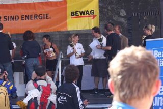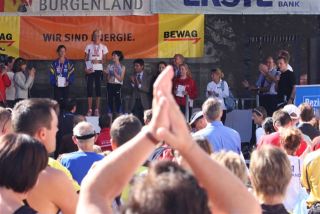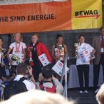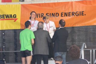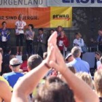 Ich war so voller Freude, hatte ich doch die ganze Zeit Angst, diese 1:35 nicht zu schaffen. Carola war knapp hinter mir ins Ziel gekommen, also das muß sich ausgehen, das wir uns einen Platz bei der Wiener Landesmeisterschaft in der Teamwertung holen. Das war ja auch DAS Ziel von diesem Lauf. Nach einer kurzen Verschnaufpause raus aus den Zielbereich und auf der suche nach Michi und Odi. Endlich, beide getroffen. Jetzt sah ich auch Vanessa, die nur mehr ein paar Meter ins Ziel hatte. Ich wollte jetzt nur noch zum Auto um mich“ trocken zu legen“. Jetzt merkte ich erst, es war sehr warm und ich war komplett naß. Beim Auto in die angenehm trockene Wäsche. Wir spazierten wieder in die Fußgängerzone, dort findet auch die Siegerehrung statt. Um 12:45 Uhr sollte die Siegerehrung der ÖM und um 13:15 Uhr die Landesmeisterschaften sein. Da wir noch etwas Zeit hatten, setzten wir uns am ende der Fußgängerzone auf ein Bankerl. Ich war schon so neugierig, auf die Ergebnisse und ging schon einmal hinauf um zu sehen, ob die Listen schon ausgehängt waren. Leider noch nicht und bin wieder runter zum Bankerl. Michi meinte, jetzt beginnt die Siegerehrung der ÖM, die sehen wir uns natürlich an. Langsam und gemütlich machten wir uns auf den Weg. Durch den Lautsprecher wurde aufgerufen: 6. Platz ÖM Regina Liebert! Ich war so etwas von Überrascht, damit hatte ich ja überhaupt nicht gerechnet. Ich war auf Halber Strecke zur Bühne, bin losgerannt – hätte beinahe meine Ehrung auf der Bühne versäumt. Endlich, dort angekommen, die anderen standen schon oben, ich war überwältigt! Ich bekam die Urkunde für den 6. Platz. Vor der Bühne sah ich unseren Verein stehen und die freuten sich mit. Vor der Bühne, noch ganz benommen von dem Gefühl, durfte ich schon wieder meinen Namen hören. Diesmal Siegerehrung für den 1. Platz in W40. Ich bekam einen schönen Pokal und einen Karton mit Nudeln (Marke Wolf). Wieder runter von der Bühne und war völlig überfordert. Jedoch es dauerte nicht lange, kam die Siegerehrung für die ÖM in der Mannschaftswertung. Als der Sprecher für den 1. Platz LG Wien (Regina Liebert, Carola Bendl-Tschiedel und Vanessa Hradecky) aufgerufen hatte, waren Vanessa (die neben mir stand) und ich nicht mehr zu halten, wie haben mal einen lauten Schrei losgelassen. Niemals hatten wir daran nur gedacht bei der ÖM in der Wertung zu sein. Da, Wien keine Hymne hat, wurde abgeleitet von Vanessas Familienname, der Radetzkymarsch gespielt. Tolle Organisation – mit viel Gefühl und Herz. Vanessa war sprachlos – Sie bekam sogar extra ein Lied gespielt. Wir bekamen eine Goldmedaille und eine Urkunde. Es sollte aber noch nicht alles sein. Ich durfte noch einmal auf die Bühne. Diesmal erhielt ich eine Goldmedaille für den 1. Platz W40-Masters. Was soll ich Euch sagen. Ich stand neben mir, bekam eigentlich gar nicht alles mit. Die Siegerehrung für die Wiener Landesmeisterschaft fand nicht in Eisenstadt statt. Wir bekommen die Medaille und Urkunde zugeschickt. Wahrscheinlich war es für mich gut, wenn ich für die Ehrung zur Wiener Landesmeisterin in HM auch noch auf die Bühne hätte müssen, wäre ich Ohnmächtig geworden. Niemals hätte ich mir in der Früh gedacht, was für ein Herrlicher Tag es werden wird. Wenn ich jetzt, heute ist schon Donnerstag, zurück an den Sonntag denke, habe ich noch immer Herzklopfen. Ich bin sehr dankbar, was ich am Sonntag erleben durfte, denn in meinem Alter 40+ läuft einem schon die Zeit davon.