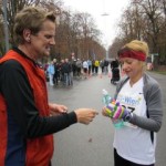 Bettina (sie ist 3:06 gelaufen) steht hinter dem Ziel und nimmt mich in Arm. Wir freuen uns, die 42,195 km hinter uns zu haben. Nach einer kurzen Erholung (Danke, an die Spenderin – zum Glück gibt es noch rauchende Zuschauer) geht es zur Siegerehrung. Ich bin zufrieden, doch noch einmal würde ich innerhalb von 4 Wochen keine 2 Marathons laufen.