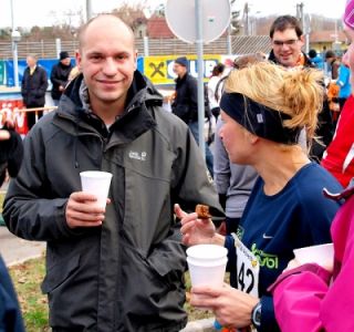 Wieder ein Anstieg, nicht so extrem wie der erste aber es fühlte sich genauso an. Hat man mir die Betonplatten noch nicht abmontiert? Jedoch, umso länger ich unterwegs war, umso wohler begann ich mich zu fühlen. Leider, jetzt bekam ich etwas Seitenstechen. Ich denke das kam vom schnellen atmen und den doch für mich ungewohnten rauf- und runterlaufen. Es war aber nicht hinderlich. Mental konnte ich das sehr gut wegstecken, da ich zu sehr damit beschäftigt war, wann ist endlich der Kilometer 8 da. Immer wieder, wenn ich so kurze Wettkämpfe laufe, da weiß ich was ich an meiner Lieblingsdistanz, Marathon habe. Niemals sind die so schrecklich wie die Läufe von 0 – 12,5 km. Ich sehe den Luftballon und darunter die Zahl 7. Einen Kilometer noch, im Kopf fange ich an, es zu genießen – bald bin ich im Ziel. Mit einer Zeit von 33:11 erreiche ich die Ziellinie. Zufrieden steuere ich auf die Punschhütte, dort übergibt mir Gerda einen süßen, heißen Tee. Danach geht es zum Kuchentisch und belohne mich mit einem Stück. Damit die Kohlenhydratspeicher wieder aufgefüllt werden. Ich plaudere noch mit lieben Freunden und gehe ins Hotel Park, wo die Siegerehrung stattfindet. Ich freue mich schon auf den Klosterneuburger Adventlauf 2012!